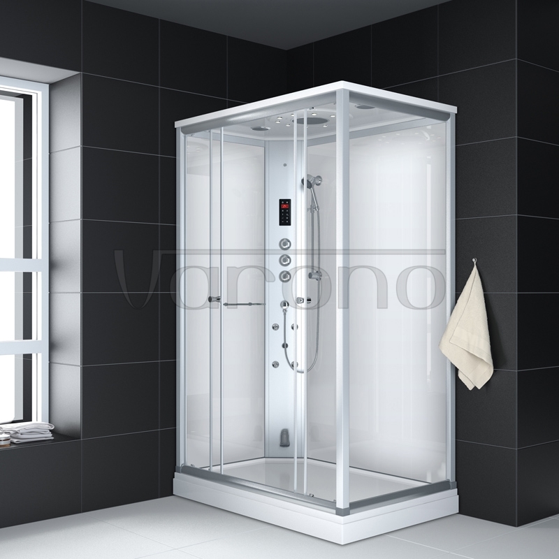 The modern designed touchscreen controls the fan, radio (with variable sound levels), light (with the possibility to change the brightness and color) and steam generator (with the possibility to set the temperature and steam duration).